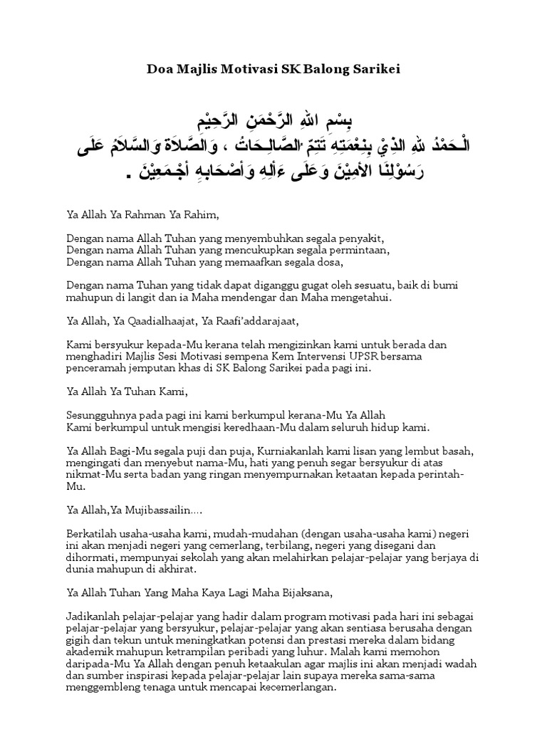 Surah Amalan Untuk Pelajar Cemerlang. View teks-pengacara-majlis-ceramah-motivasidocx from MALAYSIA L 11 at Universiti Teknologi Mara. Bacaan doa untuk majlis rasmi di sekolah 01.
